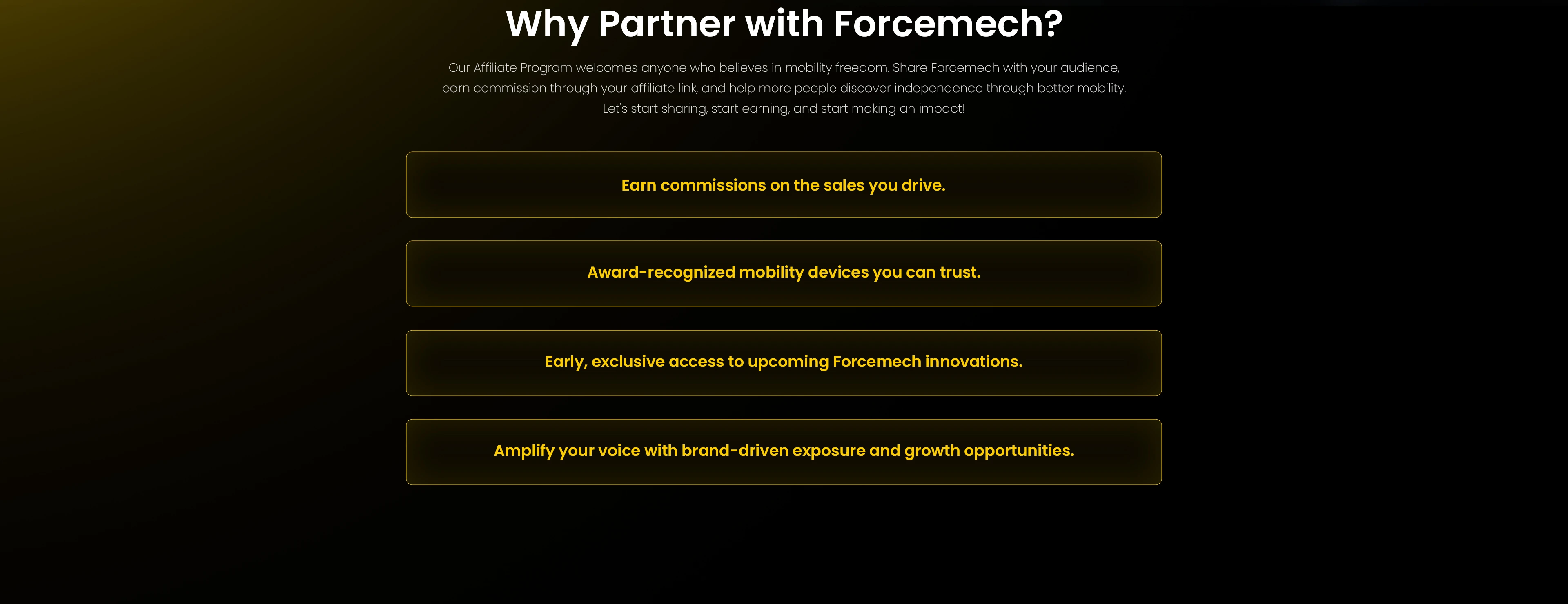 Join a community of creators who help more people discover premium mobility solutions. From ultra-light carbon fiber power chairs to FAA friendly travel models. As a Forcemech Creator Affiliate, you’ll receive dedicated support, exclusive perks, industry-leading commissions, and early access to new launches.
